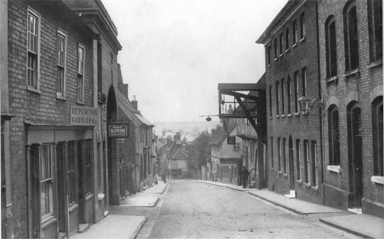The Bell and Steelyard is on the right of this photograph. On the left of the The Bell and Steelyard there is a butchers shop and a line of four cottages set back from the road.