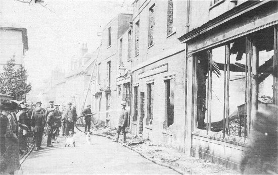 The line of single storey shops abutted a rather ugly, red brick building, which survived the fire.
