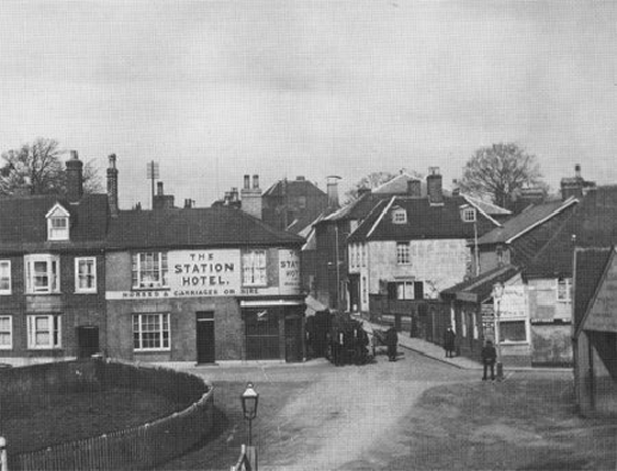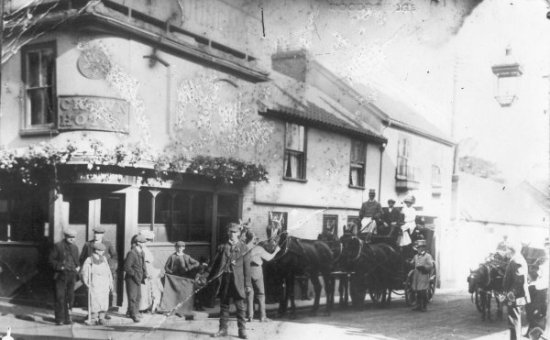 This picture of the Crown Hotel was taken towards the end of coaching era. The man in the centre of the photograph was Poll Reynolds, a self appointed traffic warden. He died in 1910 aged 32 and is buried in the old Woodbridge Cemetery. |