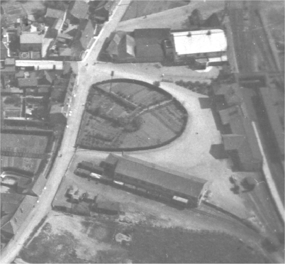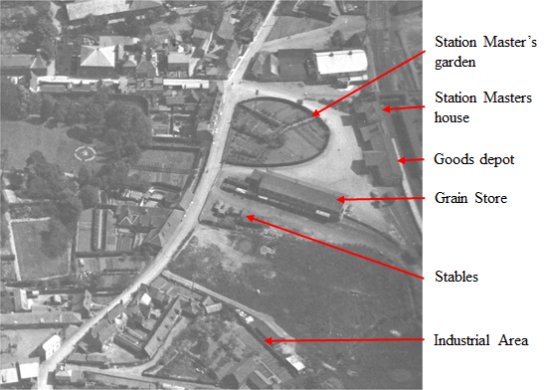 Expanded view of the station. The grain store, and the two railway lines associated with it, can be clearly seen in the lower part of this aerial photograph. |