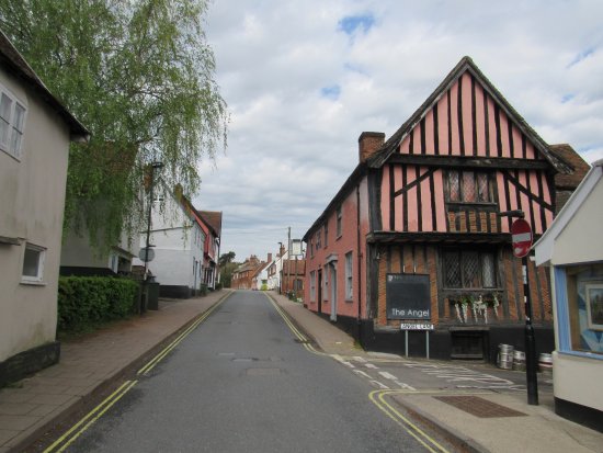 This photograph shows the entrance to Theatre Street which starts at the junction with Angel Lane. The pink timber framed building on the right is The Angel Inn. It is Grade II listed and it dates back to the sixteenth century. At the end of the building there is an extensive courtyard which was probably used by travailing players before a theatre was built an adjoining plot of land.