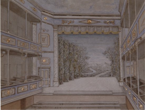 Typically, the Fisher theatres were moderate-sized buildings with a steep sloping roof. Hard backless benches covered with green baize furnished galleries, boxes and pit alike. There were two 'doors of entrance' facing the audience. A green baize curtain hung upstage of the doors, leaving a deep fore-stage. A painting, which is reputed to depict the interior of a typical Fisher Theatre, is shown on the right. |