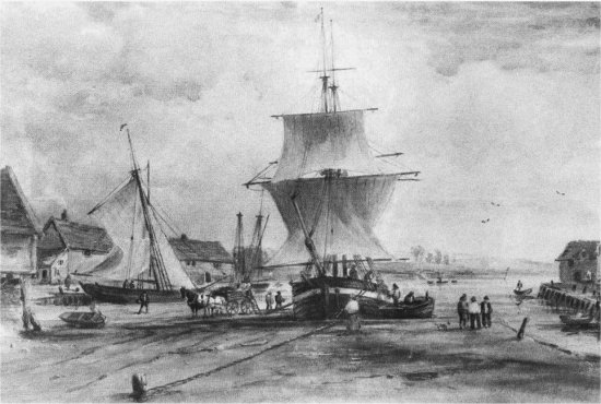 The earliest paintings and photographs of brigantines, two masted sailing ships are shown here. They are rigged square on the foremast and fore-and-aft on the mainmast. Some times the brigantines had to be lightened at Kyson Point before proceeding to the quays on Woodbridge Pool.
